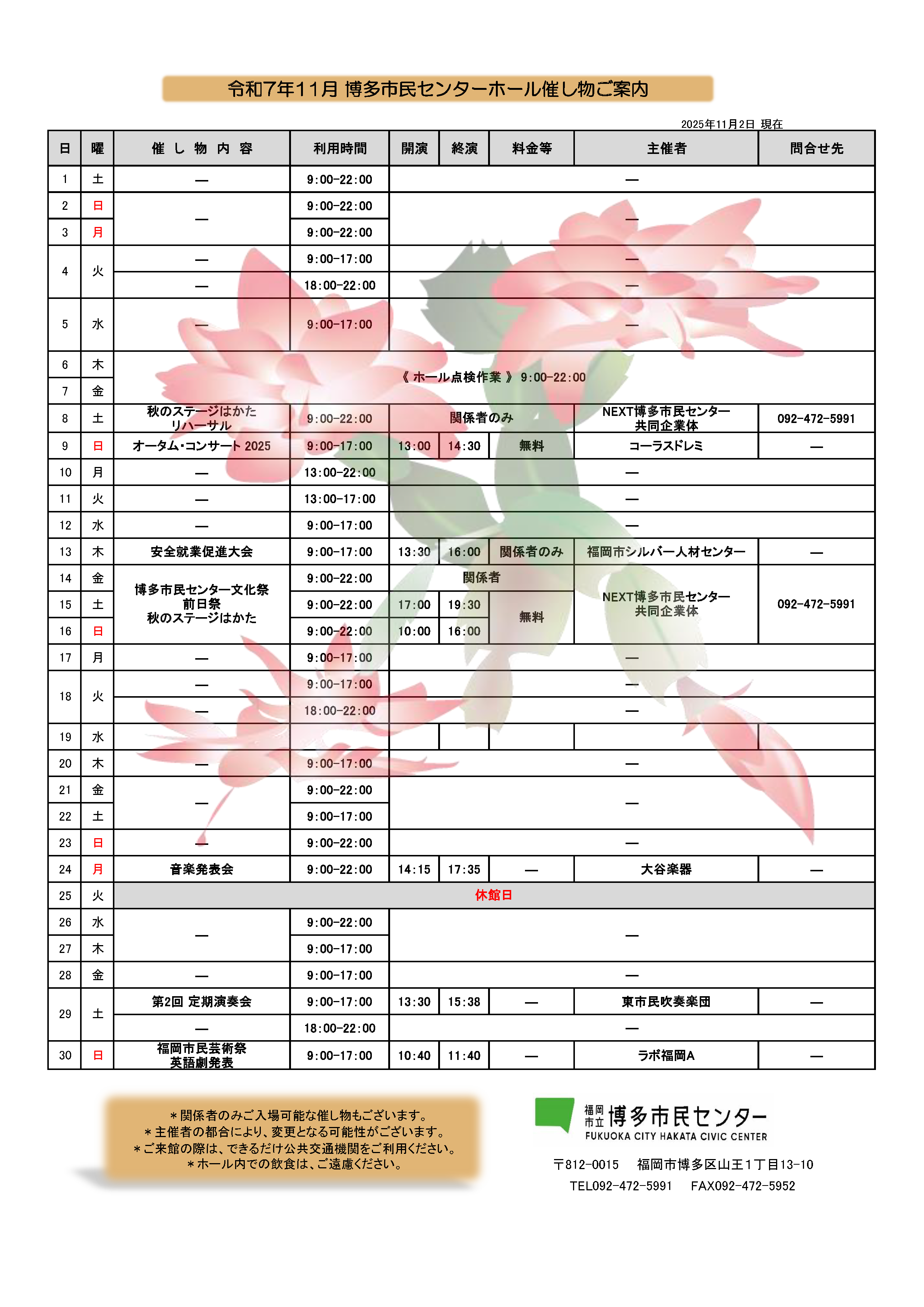 〒812-0015 福岡県福岡市博多区山王1-13-10開館時間 9:00~21:00(ホールは22:00まで)休館日 毎月最終月曜、年末年始(12/28~1/3)TEL 092-472-5991