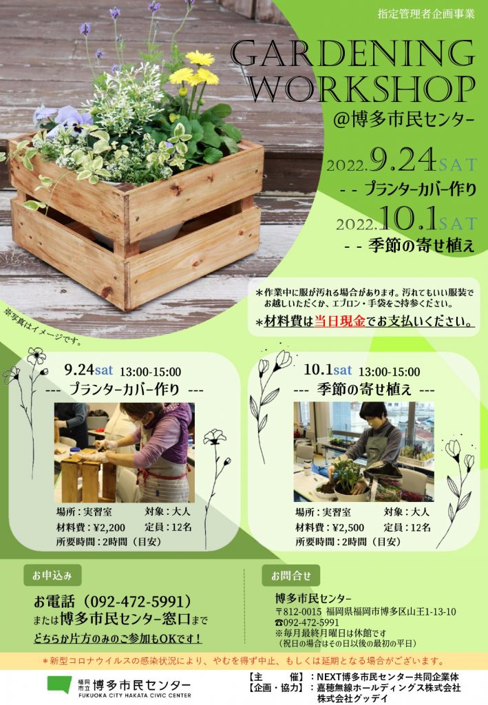 入場料 材料費: ①9/24 「プランターカバー作り」2,200円(税込)  ②10/1 「季節の寄せ植え」2,500円(税込)